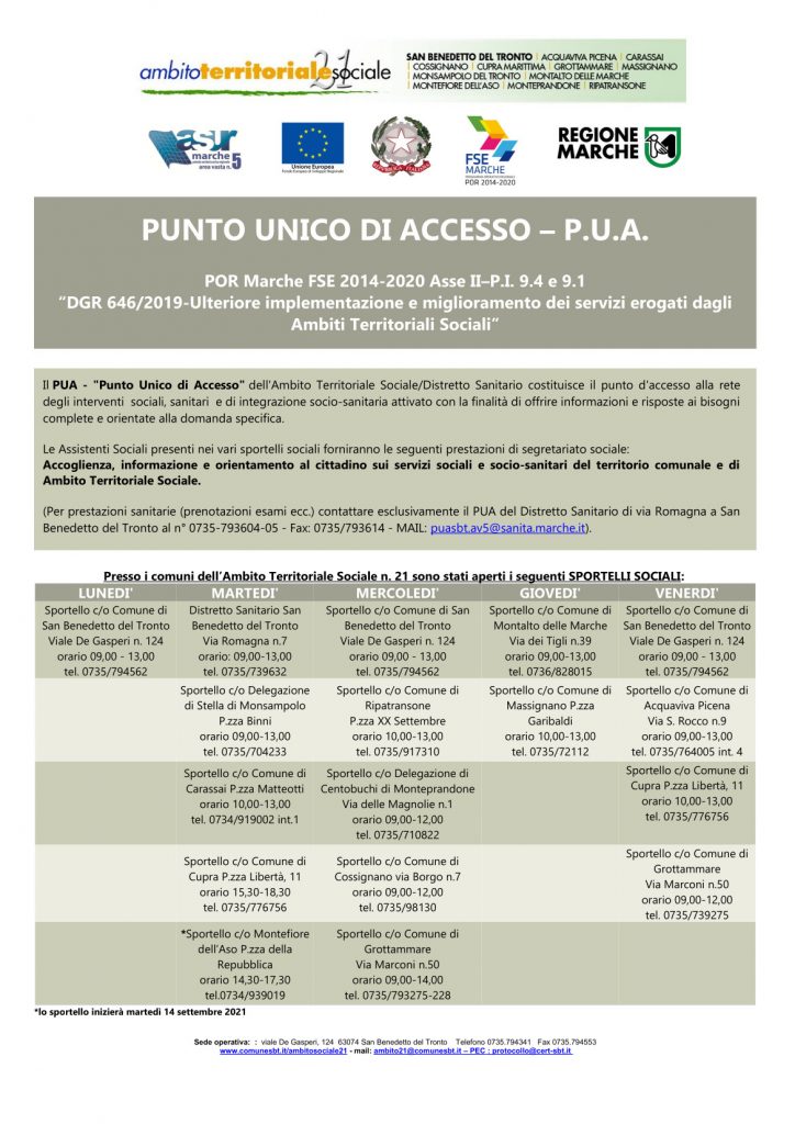 Il PUA Punto Unico di Accesso dell'Ambito Territoriale Sociale/Distretto Sanitario costituisce il punto d'accesso alla rete degli interventi sociali, sanitari e di integrazione socio-sanitaria attivato con la finalità di offrire informazioni e risposte ai bisogni complete e orientate alla domanda specifica.