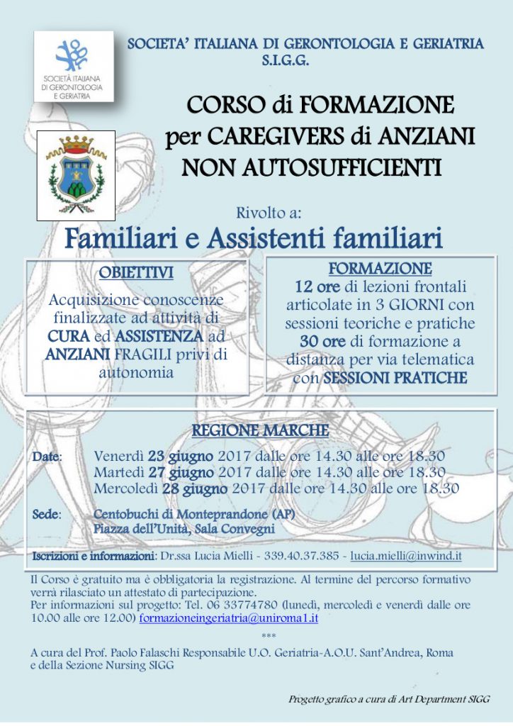 La società italiana di Gerontologia e Geriatria (S.I.G.G.), con il patrocinio del Comune di Monteprandone, organizza un corso di formazione per caregivers di anziani non autosufficienti rivolto a familiari e assistenti familiari che ha quali obiettivi l'acquisizione di conoscenze finalizzate ad attività di cura e assistenza ad anziani fragili privi di autonomia.