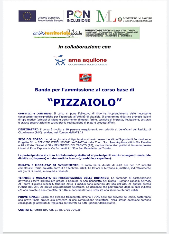 Sono aperte le iscrizioni per il corso base di pizzaiolo organizzato dall'Ambito Territoriale Sociale 21, di cui il Comune di Monteprandone fa parte, in collaborazione con la coop.sociale onlus Ama Aquilone. La partecipazione è gratuita.