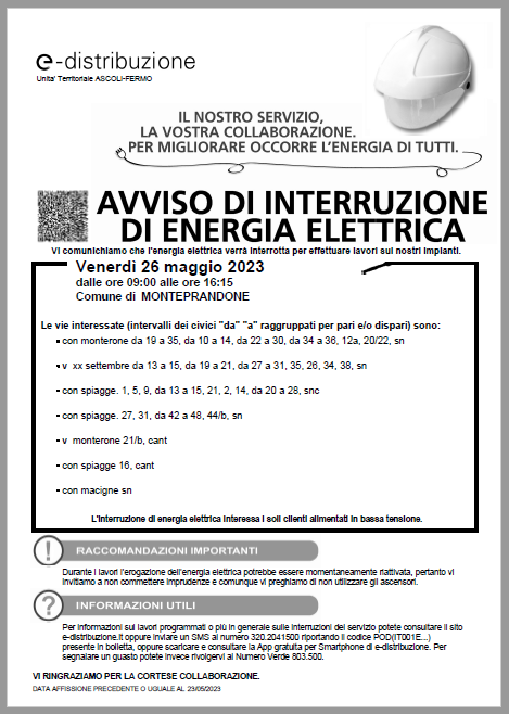 La e-distribuzione unità territoriale Ascoli - Fermo comunica che venerdì 26 maggio 2023 verrà interrotta l'energia elettrica per effettuare lavori sugli impianti situati nel Comune di Monteprandone.