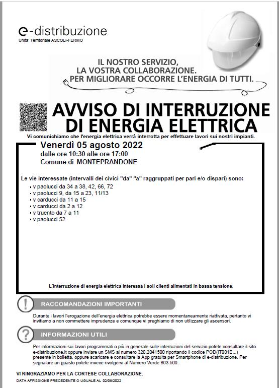 Avviso interruzione energia elettrica a Monteprandone per il 5 agosto 2022