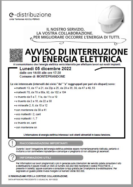 La e-distribuzione comunica che, per effettuare lavori sugli impianti, lunedì 5 dicembre 2022 dalle ore 14 alle ore 17:30, verrà interrotta l'energia elettrica nelle seguenti vie di Monteprandone: