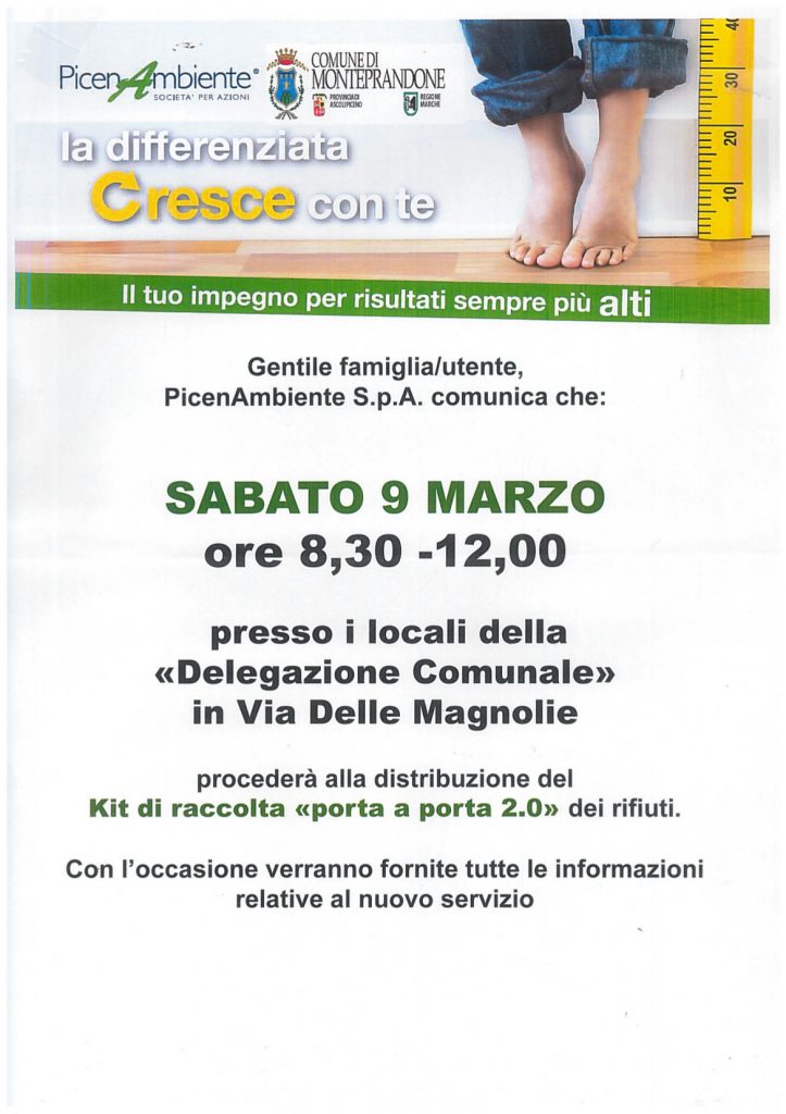 Sabato 9 marzo, dalle 8,30 alle 12 i residenti di via Bitossi possono ritirare il kit per effettuare la raccolta differenziata presso la Delegazione Comunale di Centobuchi, in via delle Magnolie n. 1.