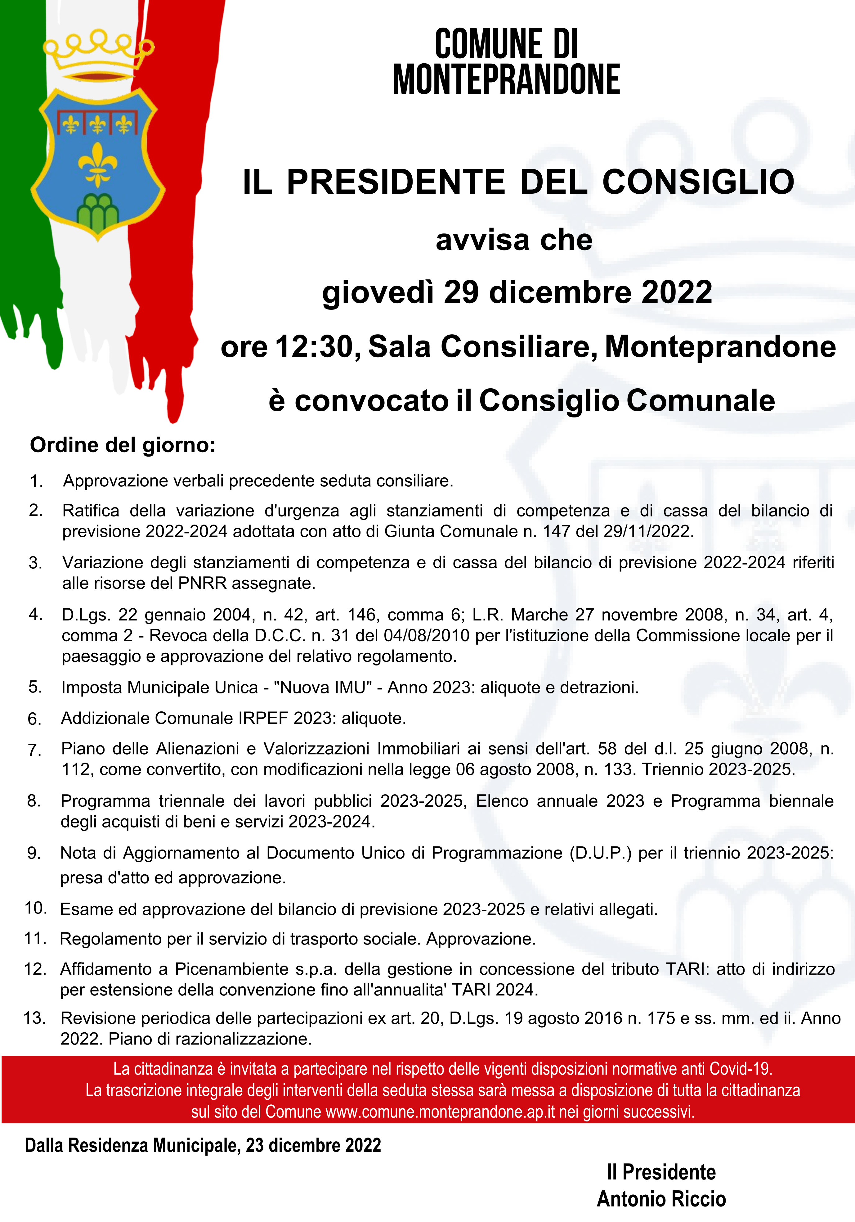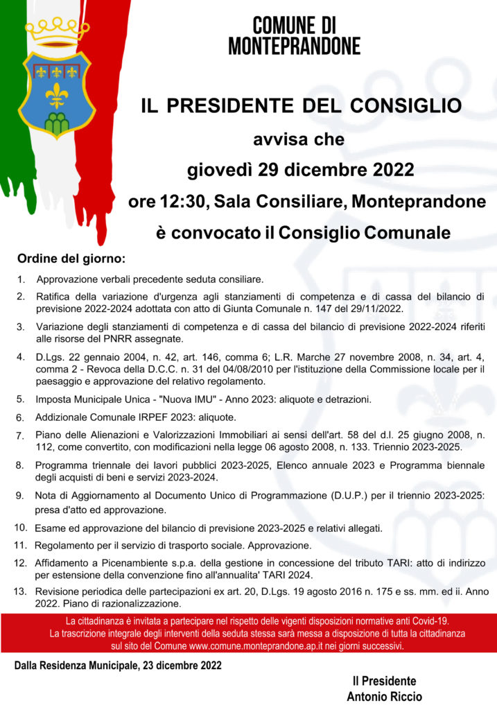 Il presidente del Consiglio comunale Antonio Riccio ha convocato per giovedì 29 dicembre, alle ore 12:30, in sessione ordinaria di prima convocazione e in seduta pubblica, presso la sala consiliare di Monteprandone per discutere il seguente: