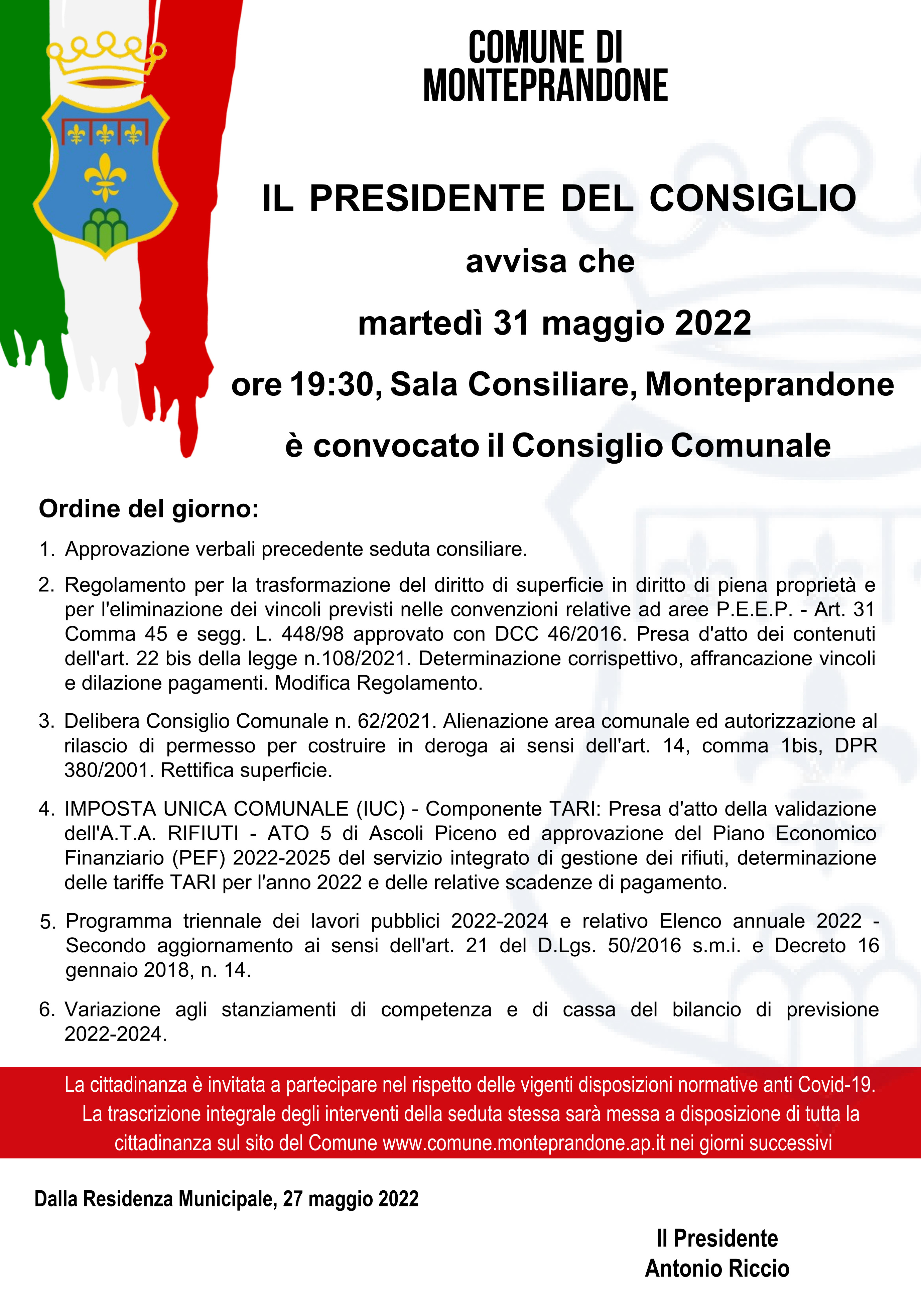 Il presidente del Consiglio comunale Antonio Riccio ha convocato per martedì 31 maggio 2022, alle ore 19:30, in sessione ordinaria di prima convocazione e in seduta pubblica, presso la sala consiliare di Monteprandone per discutere il seguente: