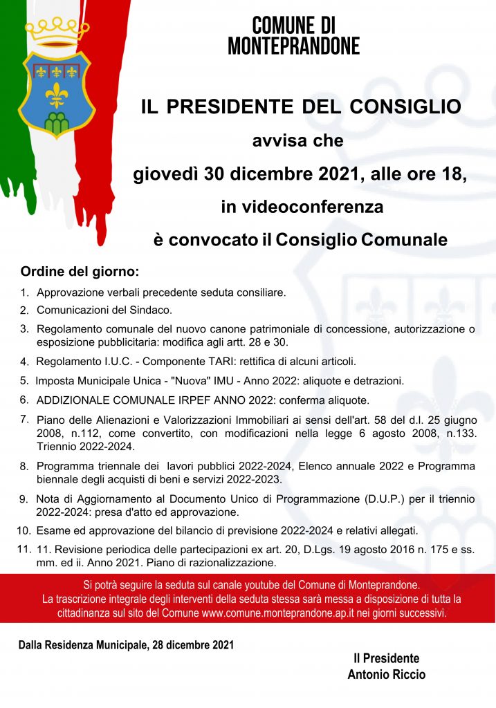 Il presidente del Consiglio comunale Antonio Riccio ha convocato per giovedì 30 dicembre 2021, alle ore 18, in sessione ordinaria in videoconferenza, è stato convocato il Consiglio comunale in videoconferenza per discutere il seguente ordine del giorno.