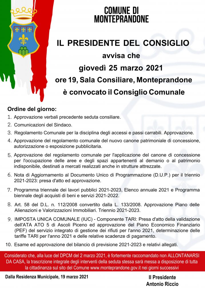 Il Presidente del Consiglio comunale Antonio Riccio ha convocato il civico consesso per giovedì 25 marzo 2021, alle ore 19, in prima sessione e in seduta pubblica presso la sala consiliare del Comune di Monteprandone.