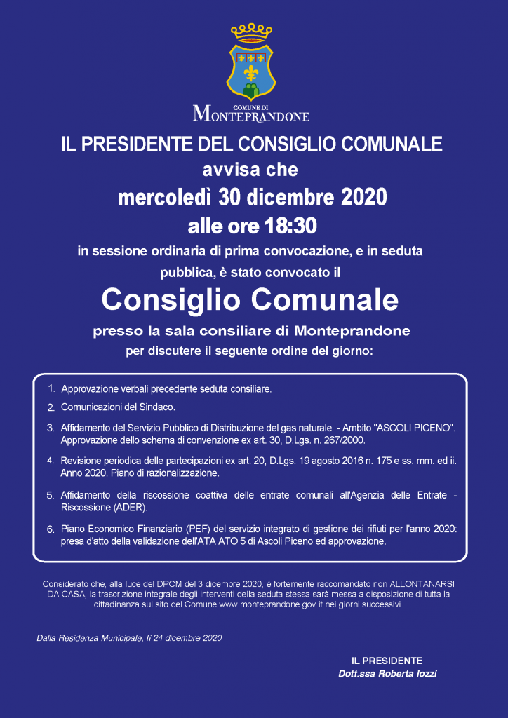 Il Presidente del Consiglio comunale Roberta Iozzi ha convocato il civico consesso per mercoledì 30 dicembre 2020, alle ore 18:30, in prima sessione e in seduta pubblica presso la sala consiliare del Comune di Monteprandone.