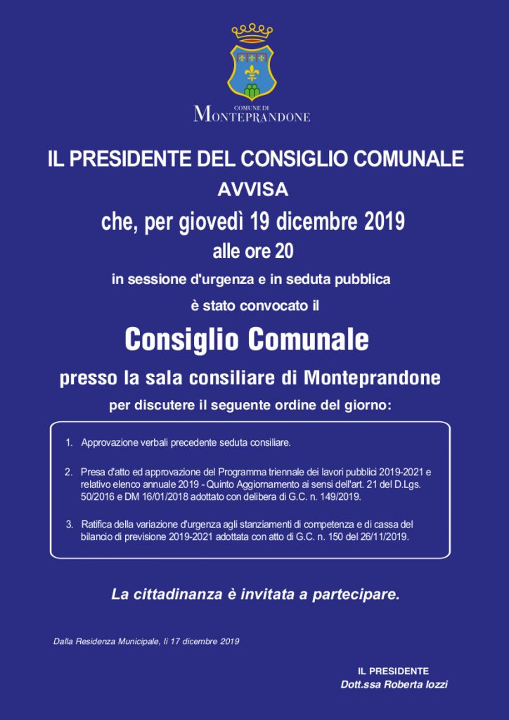 Il Presidente del Consiglio comunale Roberta Iozzi ha convocato il civico consesso per giovedì 19 dicembre 2019, alle ore 20, in sessione d'urgenza e in seduta pubblica presso la sala consiliare del Comune di Monteprandone.