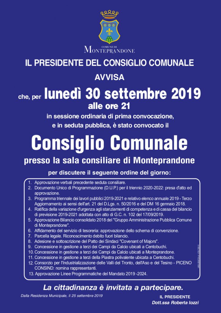 Il Presidente del Consiglio Comunale Roberta Iozzi ha convocato il civico consesso per lunedì 30 settembre 2019, alle ore 21, in sessione ordinaria di prima convocazione e in seduta pubblica presso la sala consiliare del Comune di Monteprandone.