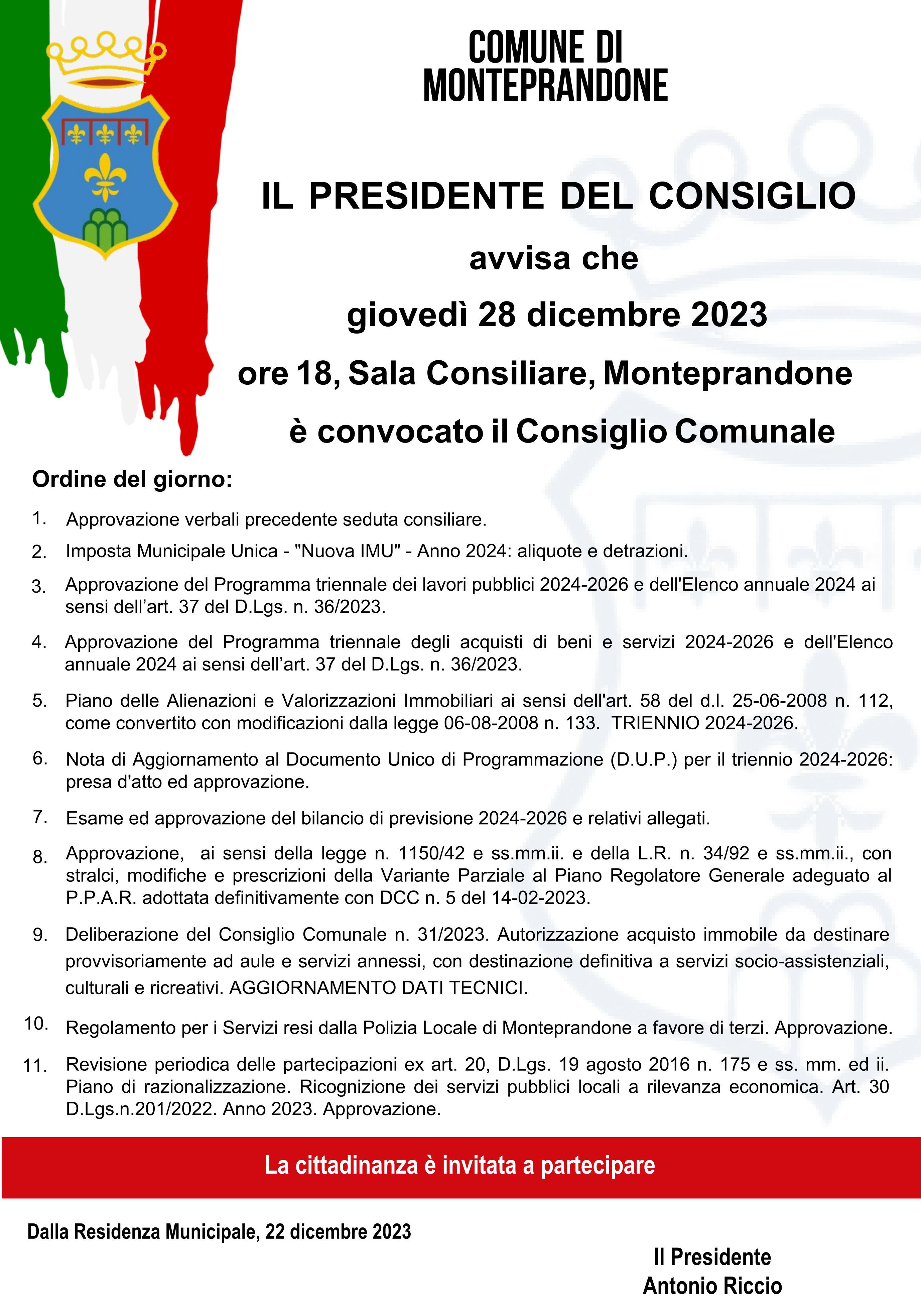 Il presidente del Consiglio comunale Antonio Riccio ha convocato per giovedì 28 dicembre 2023, alle ore 18, in sessione ordinaria di prima convocazione e in seduta pubblica, presso la sala consiliare di Monteprandone per discutere il seguente: