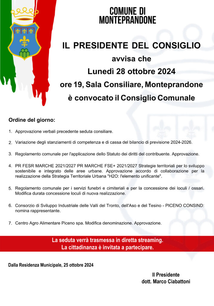 Il Presidente del Consiglio comunale Marco Ciabattoni avvisa che, per lunedì 28 ottobre 2024, alle ore 19, in sessione ordinaria di prima convocazione e in seduta pubblica, è stato convocato il Consiglio Comunale, presso la sala consiliare di Monteprandone, per discutere il seguente ordine del giorno: