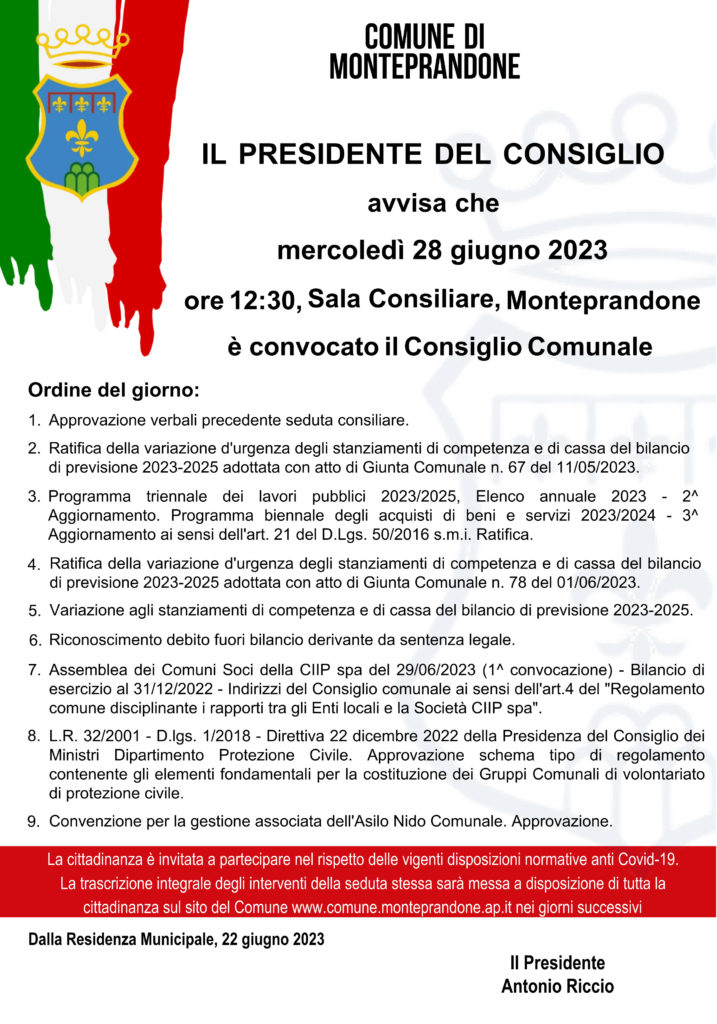 Il presidente del Consiglio comunale Antonio Riccio ha convocato per mercoledì 28 giugno, alle ore 12:30, in sessione ordinaria di prima convocazione e in seduta pubblica, presso la sala consiliare di Monteprandone per discutere il seguente:
