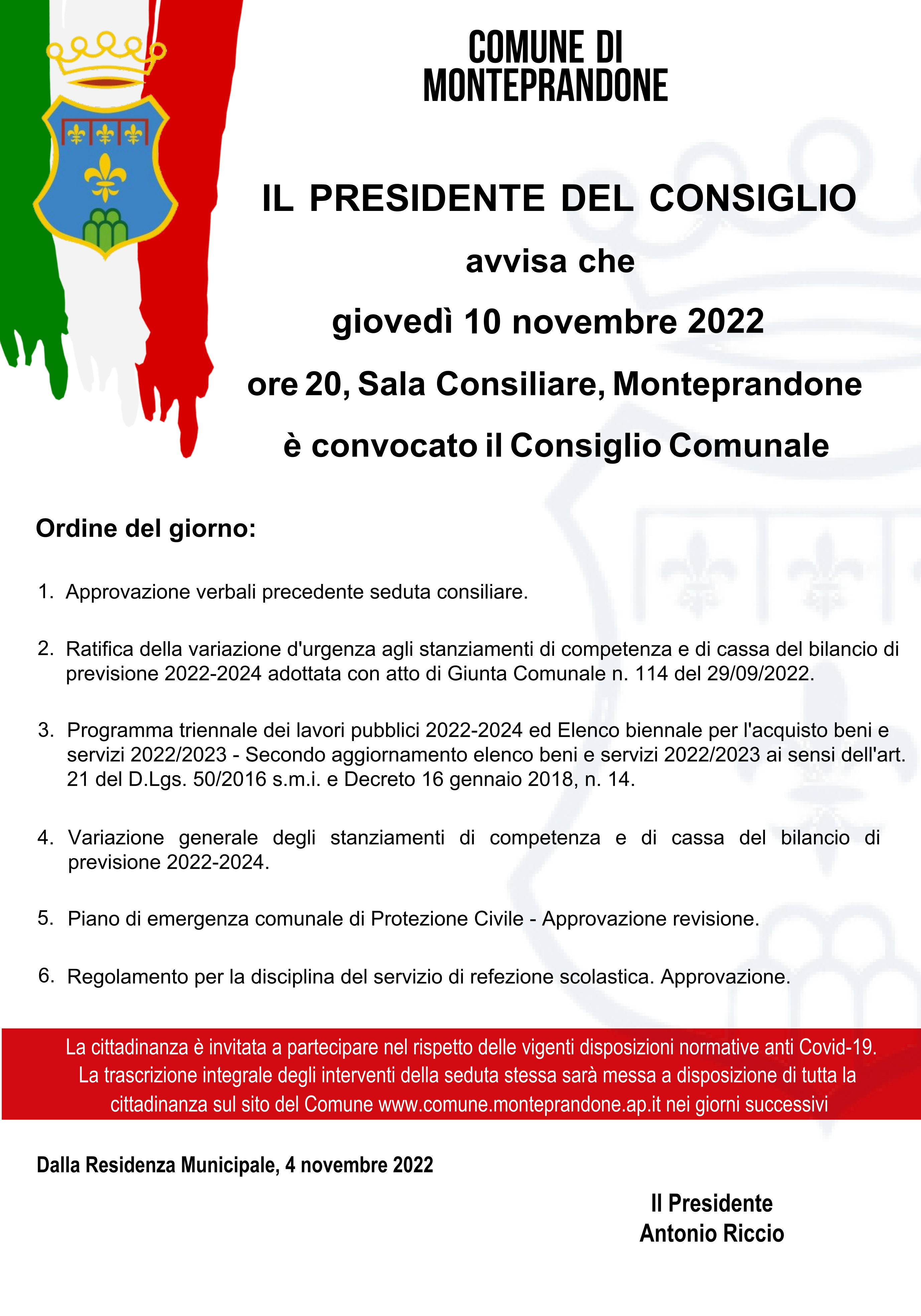Il presidente del Consiglio comunale Antonio Riccio ha convocato per giovedì 10 novembre 2022, alle ore 20, in sessione ordinaria di prima convocazione e in seduta pubblica, presso la sala consiliare di Monteprandone per discutere il seguente: