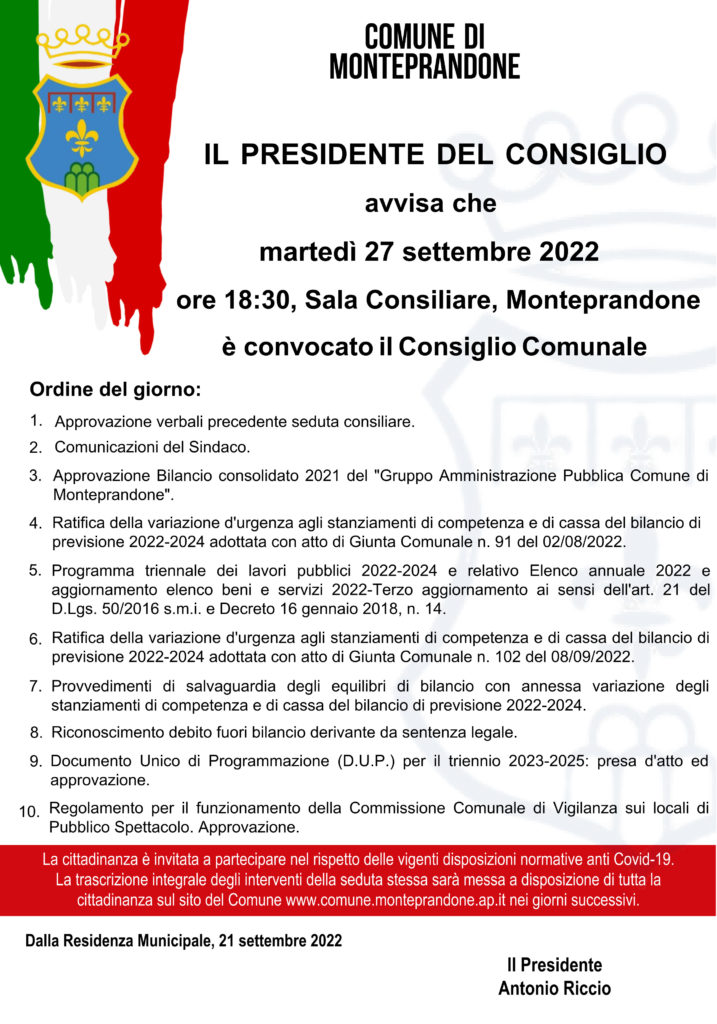 Il presidente del Consiglio comunale Antonio Riccio ha convocato per martedì 27 settembre 2022, alle ore 18:30, in sessione ordinaria di prima convocazione e in seduta pubblica, presso la sala consiliare di Monteprandone per discutere il seguente: