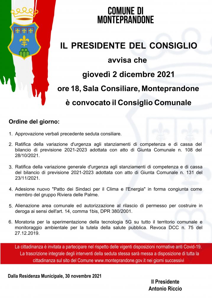 Il Presidente del Consiglio comunale Antonio Riccio ha convocato il civico consesso per giovedì 2 dicembre 2021, alle ore 18, in prima sessione e in seduta pubblica presso la sala consiliare del Comune di Monteprandone.
