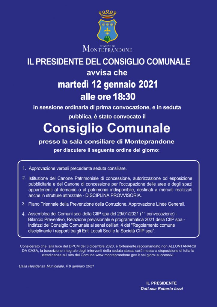 Il Presidente del Consiglio comunale Roberta Iozzi ha convocato il civico consesso per martedì 12 gennaio 2021, alle ore 18:30, in prima sessione e in seduta pubblica presso la sala consiliare del Comune di Monteprandone.