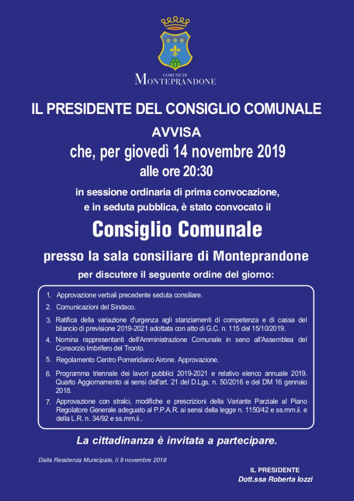 Il Presidente del Consiglio Comunale Roberta Iozzi ha convocato il civico consesso per giovedì 14 novembre 2019, alle ore 20.30, in sessione ordinaria di prima convocazione e in seduta pubblica presso la sala consiliare del Comune di Monteprandone.