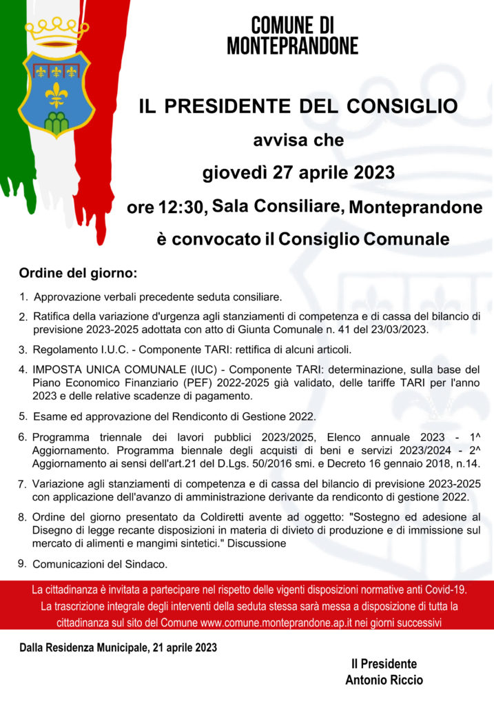 Il presidente del Consiglio comunale Antonio Riccio ha convocato per giovedì 27 aprile, alle ore 12:30, in sessione ordinaria di prima convocazione e in seduta pubblica, presso la sala consiliare di Monteprandone per discutere il seguente: