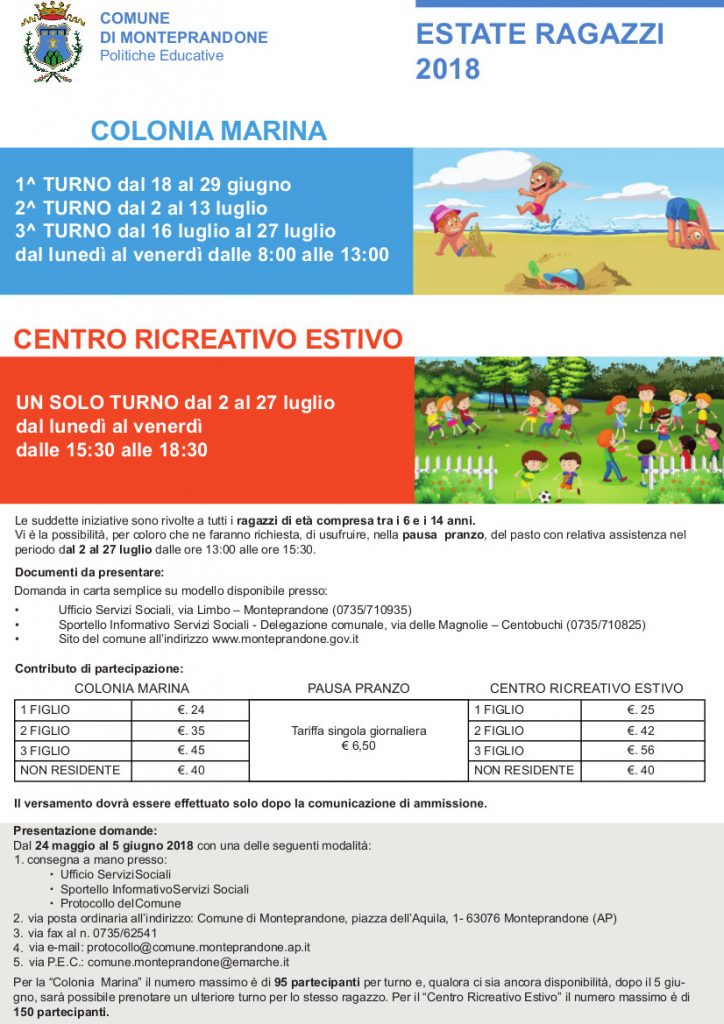 Anche quest’anno, il Comune di Monteprandone organizza “Estate ragazzi” un programma di attività estive rivolte a bambini e ragazzi da 6 a 14 anni: la Colonia Marina presso uno chalet di San Benedetto del Tronto e il Centro Ricreativo Estivo presso la scuola di Colle Gioioso a Monteprandone.