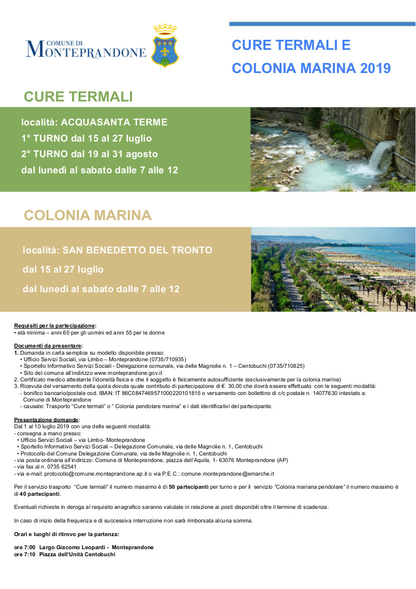 Per l’estate 2019 il Comune di Monteprandone organizza servizi di trasporto per le cure termali ad Acquasanta Terme e la Colonia marina a San Benedetto per uomini over 60 e donne over 55.
