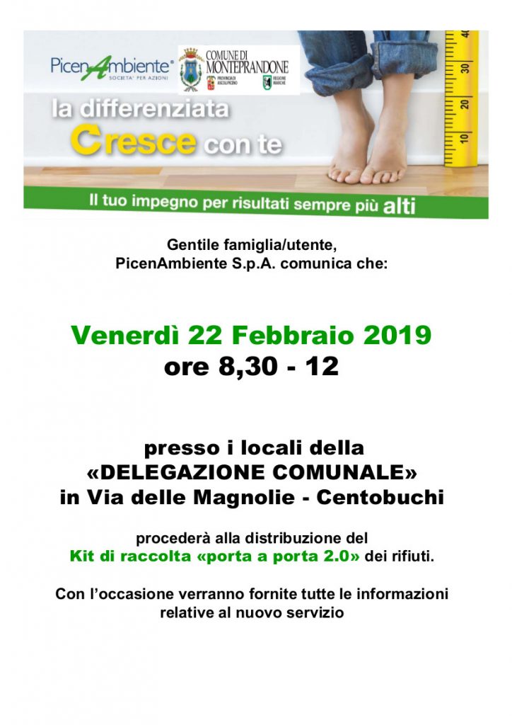 I cittadini interessati possono recarsi presso la Delegazione Comunale di Centobuchi, in via delle Magnolie n. 1, nella mattinata di venerdì 22 febbraio, dalle ore 8,30 alle ore 12. Oltre ai mastelli, gli operatori di Picenambiente forniranno tutte le informazioni necessarie sul nuovo sistema 2.0.