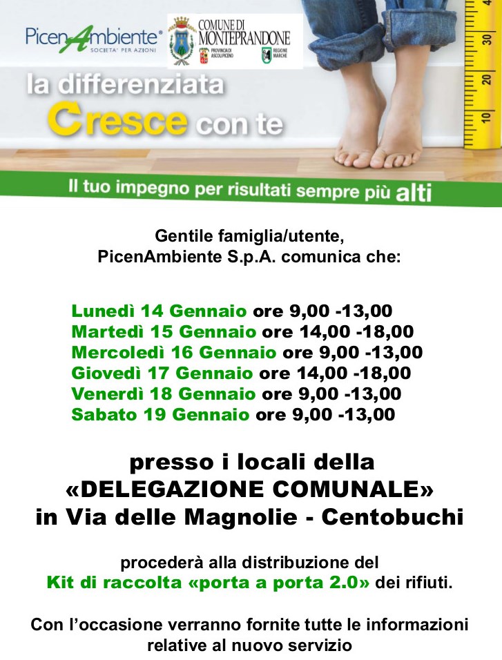 Come già comunicato nel corso dell’assemblea pubblica tenutasi lo scorso dicembre, da lunedì 14 a sabato 19 gennaio, presso la Delegazione Comunale di Centobuchi, verranno distribuiti i kit a tutti i residenti nella zona nord Salaria (zona 2) per effettuare il nuovo metodo di raccolta Porta a Porta 2.0.