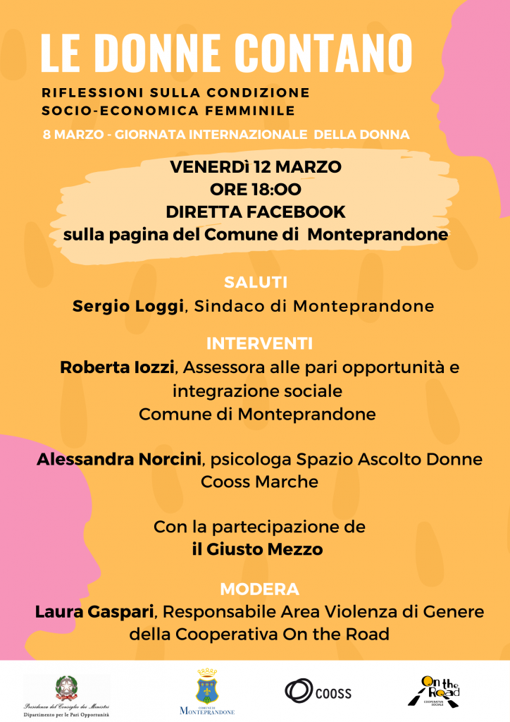 In occasione dell’8 marzo Giornata internazionale della donna, il Comune di Monteprandone in collaborazione con la cooperativa On the road e la cooperativa Cooss Marche, organizza l’incontro “Le donne contano. Riflessioni sulla condizione socio-economica femminile”.