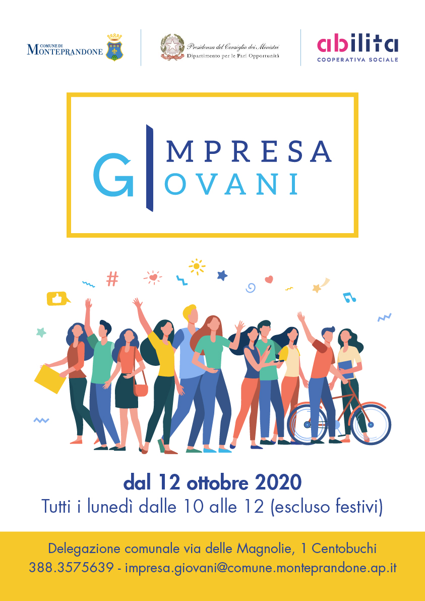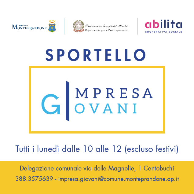 Ulteriori informazioni su indicazioni operative per avviare un’impresa, aggiornamenti, scadenze e bandi verranno fornite sui canali social del Comune: pagina Facebook GiovArti e Comune di Monteprandone oltre che sul sito istituzionale del Comune nella pagina dedicata allo Sportello Impresa Giovani.