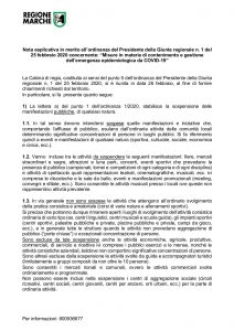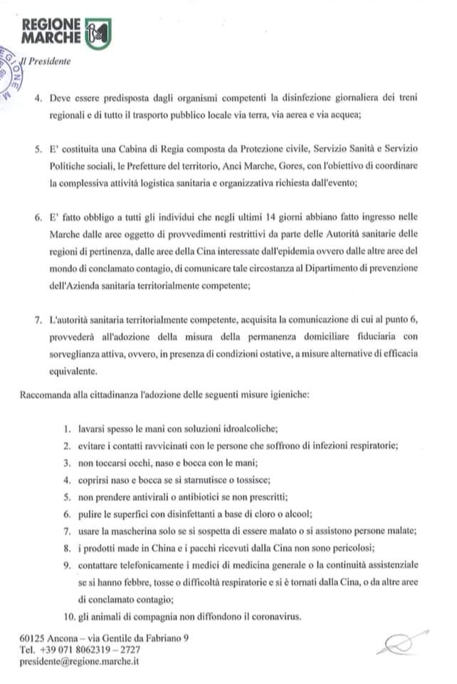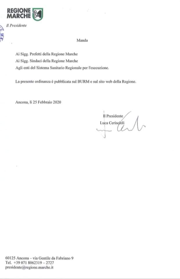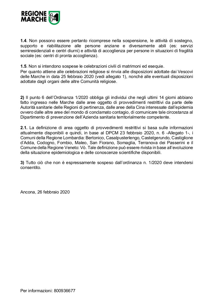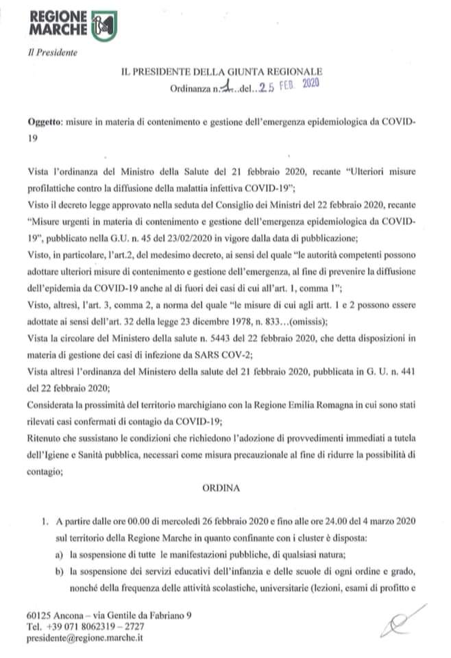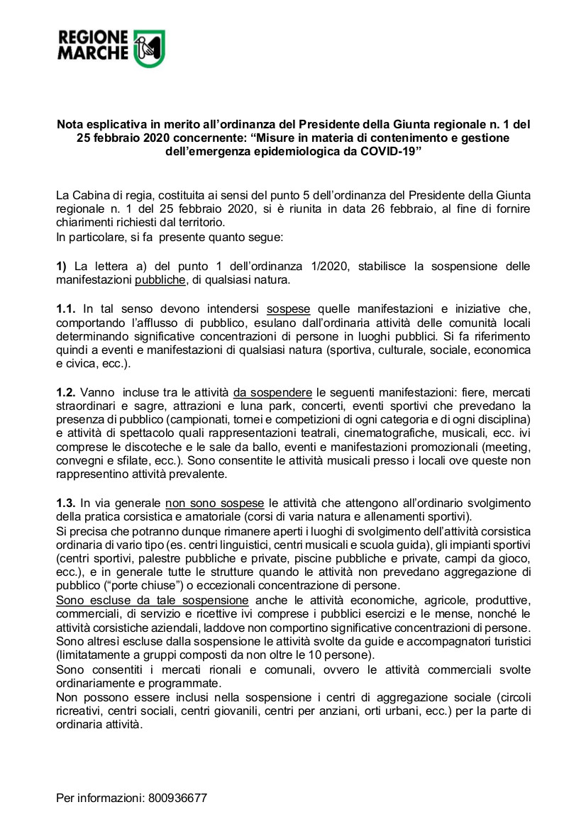In data 26 febbraio la Regione Marche ha diffuso una nota esplicativa in merito all’ordinanza del Presidente della Giunta regionale n. 1 del 25 febbraio 2020.