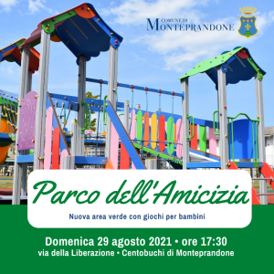 Aprirà domenica 29 agosto, alle ore 17:30, in via della Liberazione a Centobuchi di Monteprandone il nuovo Parco dell’Amicizia. Si tratta di ben 1560 mq di verde pubblico recintato e attrezzato con giochi per bambini conformi, realizzati con materiali rinnovabili, ecologici e durevoli, certificati per la riduzione della produzione di Co2.