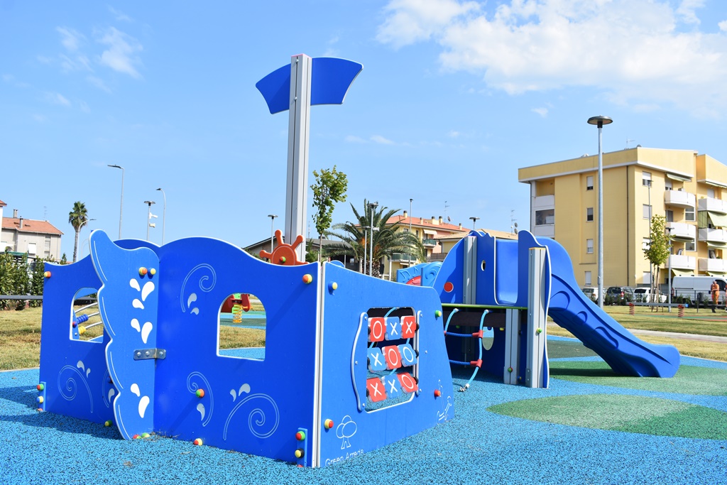 L’area è suddivisa in ambienti, dedicati alle quattro abilità motorie di base: area della manualità, della mobilità, dell’equilibrio e del gioco simbolico. Diverse le tipologie di gioco presenti: molle inclusive, altalene, bilico, giochi combinati con scivoli a tubo e aperti per i più grandi e un’area ludica a misura dei bimbi più piccoli.