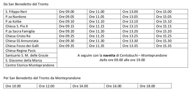 Il servizio navetta Centobuchi - Monteprandone andata e ritorno si svolgerà dalle 9 alle 19 e sono previste le seguenti fermate: Contrada Sant'Anna, piazza dell'Unità, chiesa Regina Pacis, Santuario Santa Maria delle Grazie e San Giacomo della Marca, Centro Storico Monteprandone.