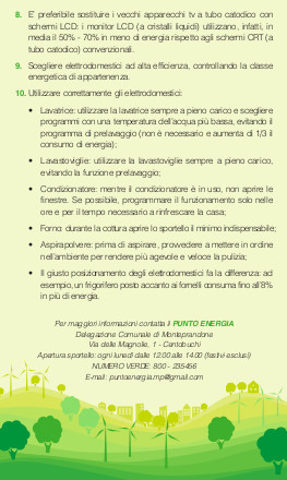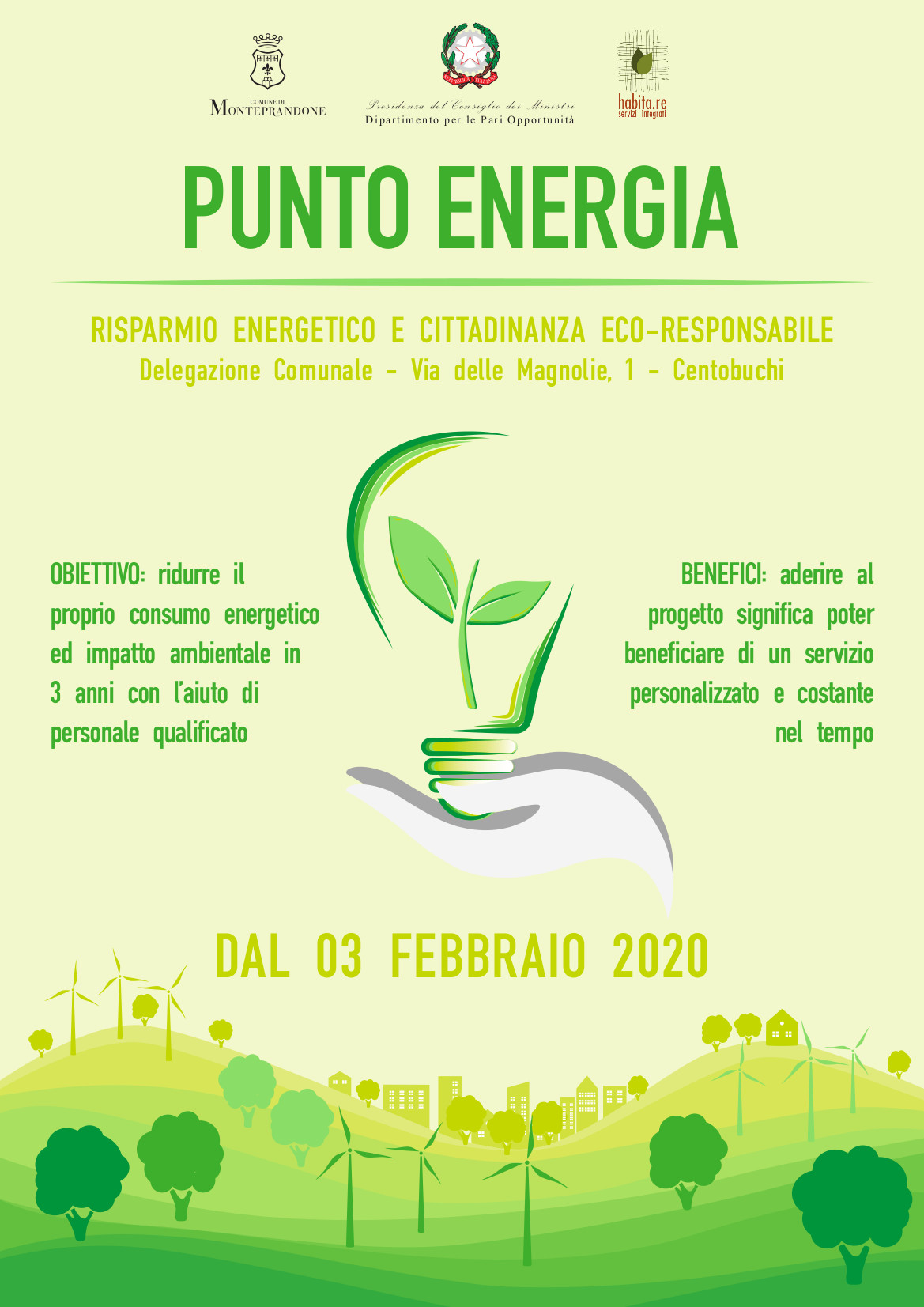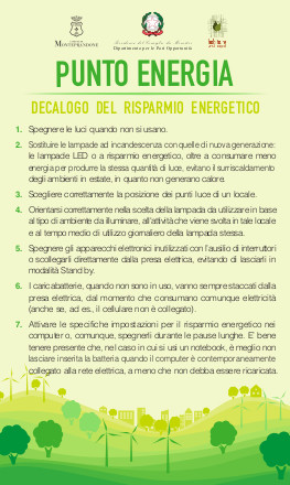 Lo sportello Punto Energia ha lo scopo di esemplificare l’eco-risparmio attraverso l’utilizzo di una lampadina a risparmio energetico, che verrà consegnata alle prime 1000 famiglie residenti nel Comune di Monteprandone che parteciperanno all’iniziativa insieme ad un decalogo del buon risparmio.