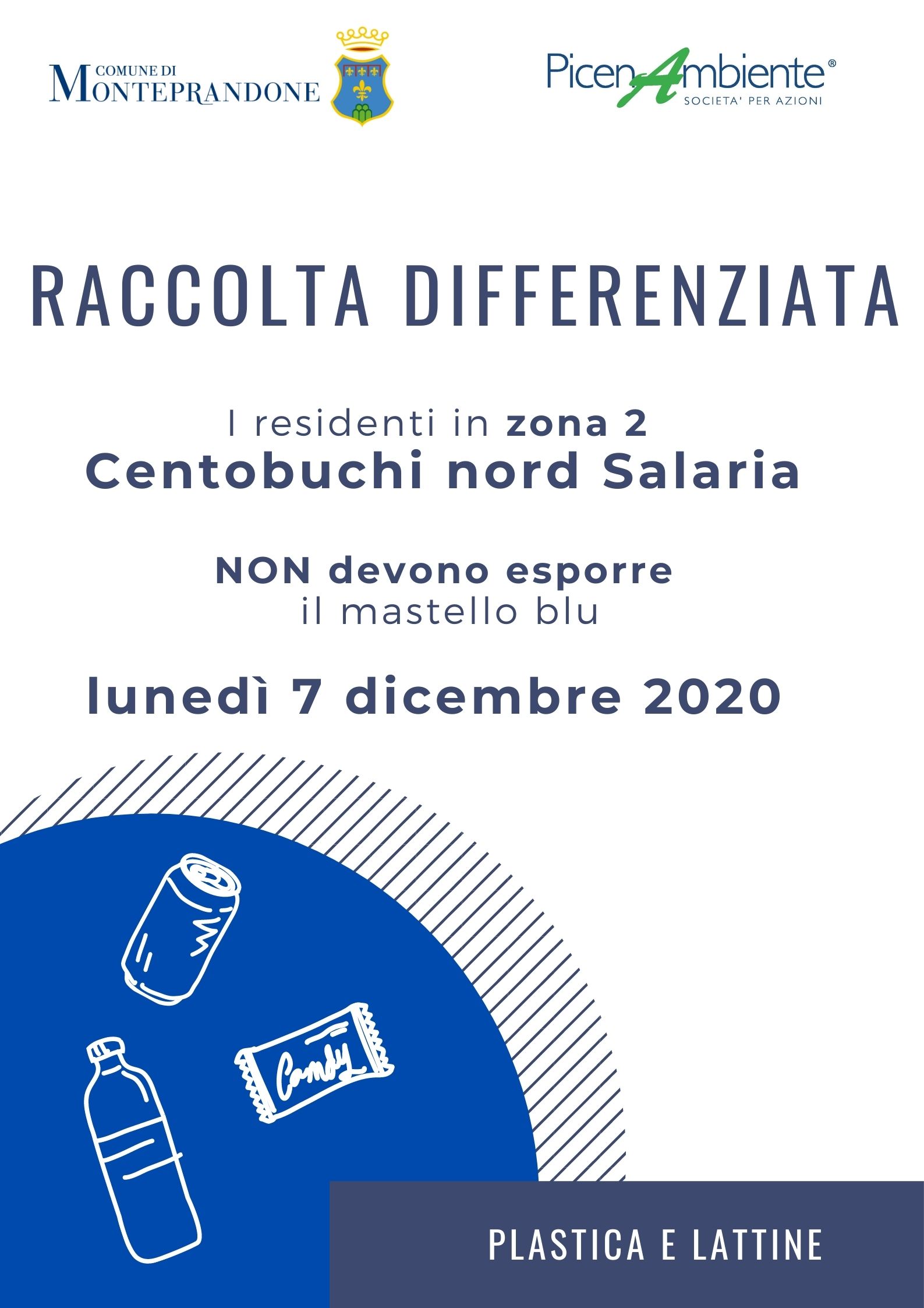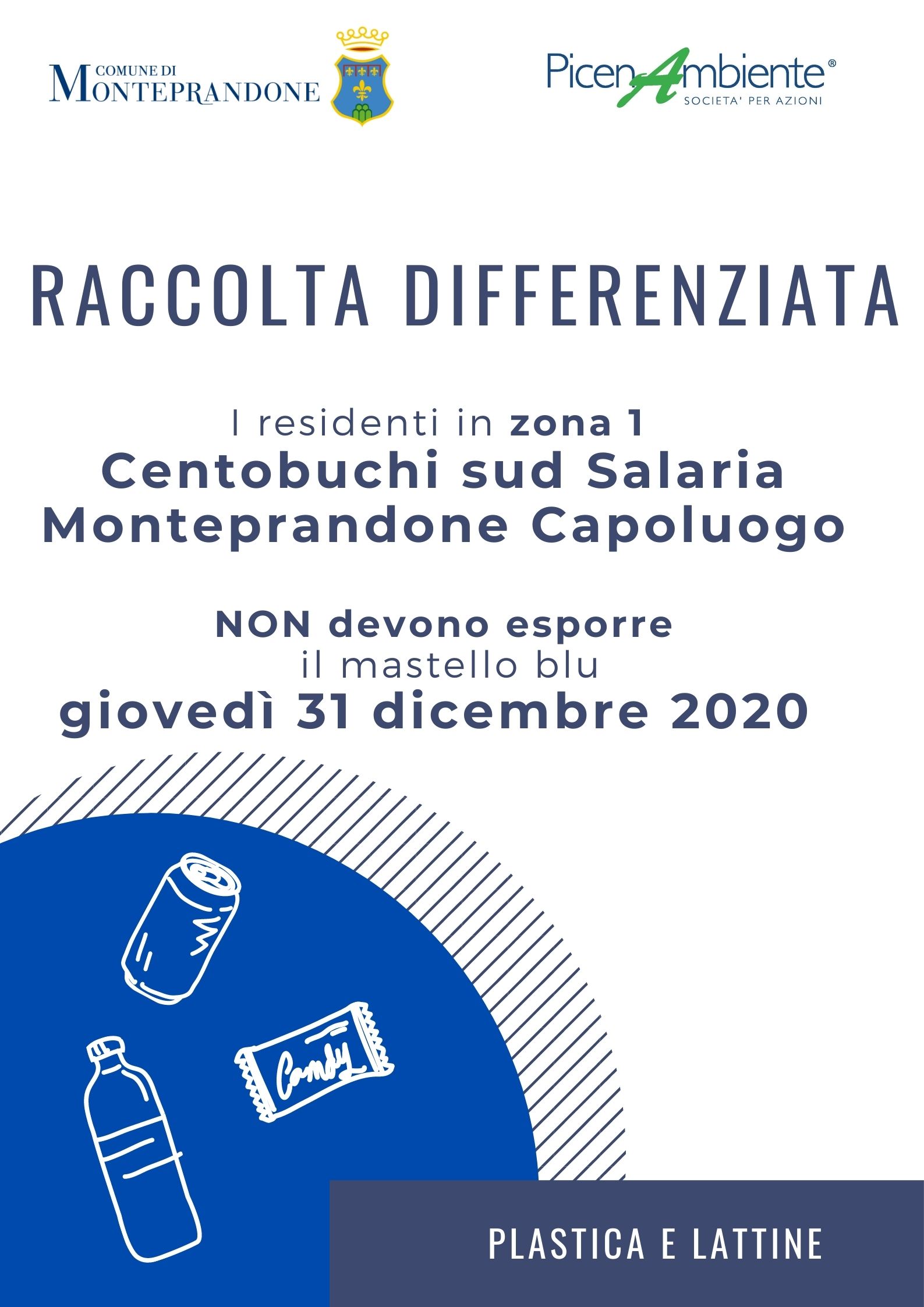 La Picenambiente e il Comune di Monteprandone ricordano che il mastello blu della raccolta differenziata di plastica e lattine non deve essere esposto: