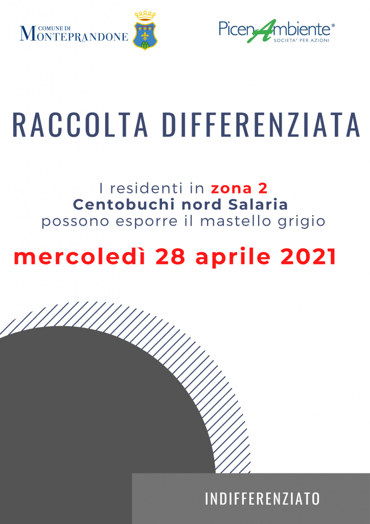 Il Comune di Monteprandone e la PicenAmbiente ricordano che solo per questa settimana, nella zona 2, Centobuchi nord Salaria, ci sarà un cambio di giorno per esporre il mastello grigio.
