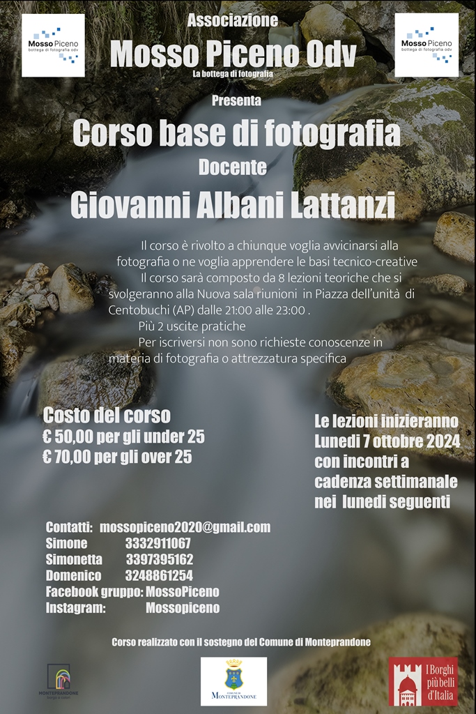L’Associazione Mosso Piceno, con il patrocinio e il sostegno del Comune di Monteprandone, organizza a Centobuchi un nuovo corso base di fotografia, rivolto a chi desidera iniziare a imparare e utilizzare la propria fotocamera, sia essa una reflex o uno smartphone, e a chi vuole approfondire alcune tematiche relative al mondo fotografico.