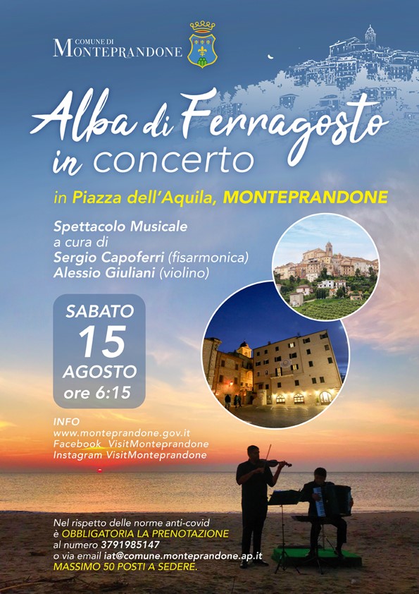 Sabato 15 agosto da non perdere il concerto “Alba di Ferragosto” a Monteprandone. Dalla suggestiva piazza dell’Aquila, nel Centro storico, sarà possibile ammirare il sorgere del sole accompagnati dalle note dei maestri Sergio Capoferri e Alessio Giuliani.