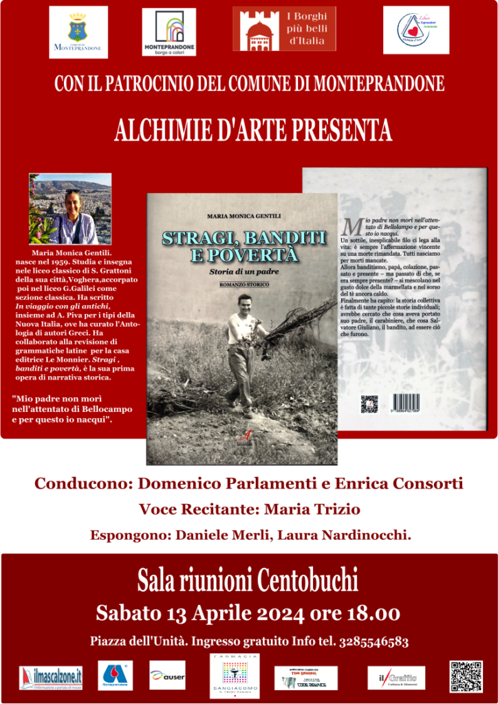 Quinto evento di Alchimie d’Arte del 2024 e terzo romanzo storico, sabato 13 aprile 2024, ore 18, alla sala riunioni Piazza dell’Unità a Centobuchi (AP), con il patrocinio del comune di Monteprandone, la collaborazione di Avis Monteprandone, Code Service, Auser Monteprandone e Farmacia San Giacomo, l’Associazione presenterà la scrittrice: Maria Monica Gentili, e il suo primo romanzo, storico “Stragi, Banditi e povertà...storia di un padre” ediz. Artestampa.