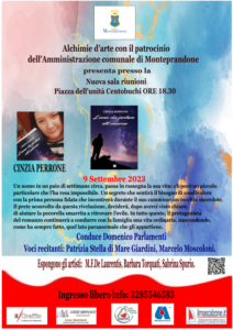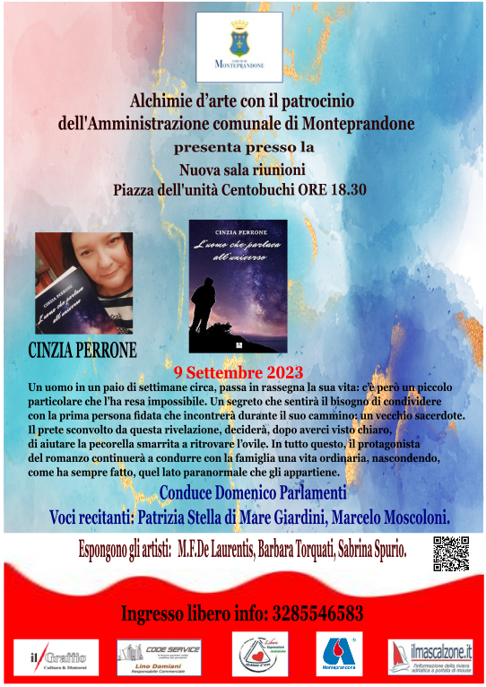 Secondo appuntamento di settembre 2023 di Alchimie d’arte, con il Patrocinio del Comune di Monteprandone e la collaborazione di Avis Monteprandone a Centobuchi nella “Sala riunioni” di piazza dell’Unità, ore 18.30. Con Cinzia Perrone il suo Libro: “L’uomo che parlava all’universo” il suo curriculum e la sinossi.