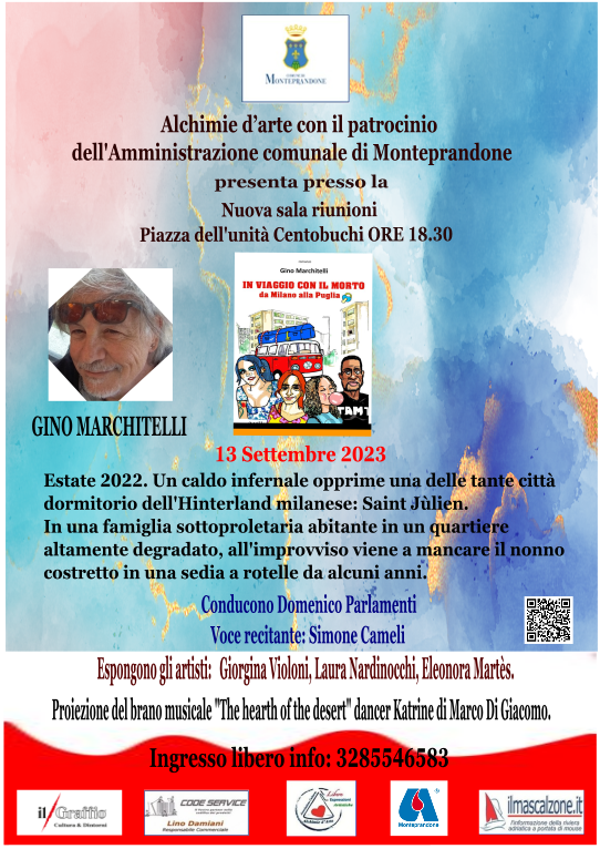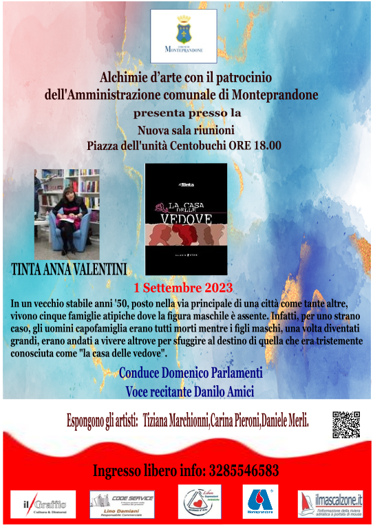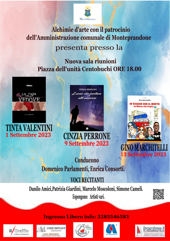 Tre autori eccellenti per i prossimi eventi settembrini di Alchimie d’arte, con il Patrocinio del Comune di Monteprandone e la collaborazione di Avis Monteprandone a Centobuchi nella “Sala riunioni” di piazza dell’Unità, ore 18.00. Tinta Anna Valentini,Cinzia Perrone e Gino Marchitelli. La maratona parte il 1 Settembre 2023 con Tinta Anna Valentini interessante e lungo, il suo curriculum.