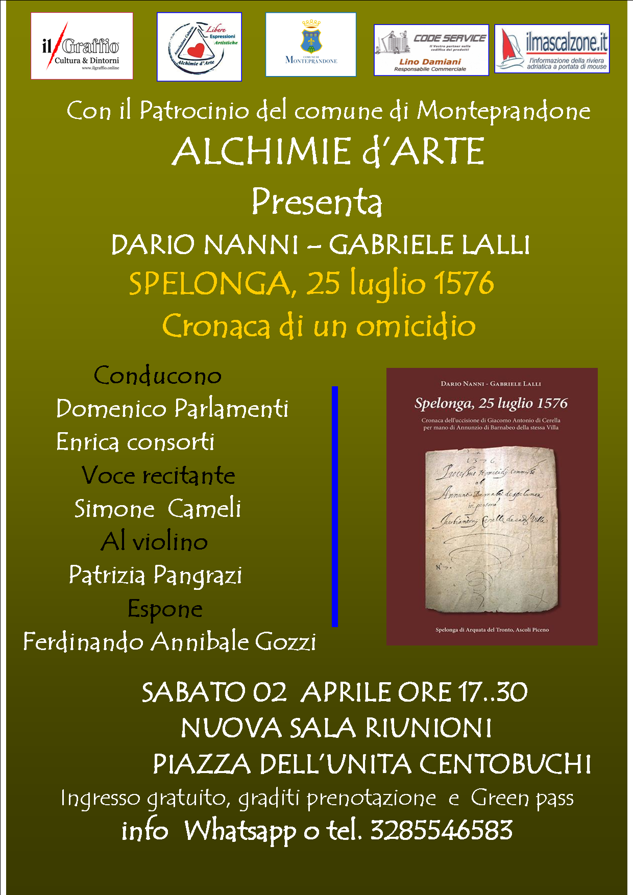 Sabato 2 Aprile 2022 ore 17.30 presso la nuova sala riunioni, in piazza dell’Unità a Centobuchi, l'associazione Alchimie d’Arte, con il Patrocino del Comune di Monteprandone, presenterà il libro di Dario Nanni e Gabriele Lalli "Spelonga, 25 Luglio 1576. Cronaca dell’uccisione di Giacomo di Cerella per mano di Annunzio di Barnabeo della stessa villa".