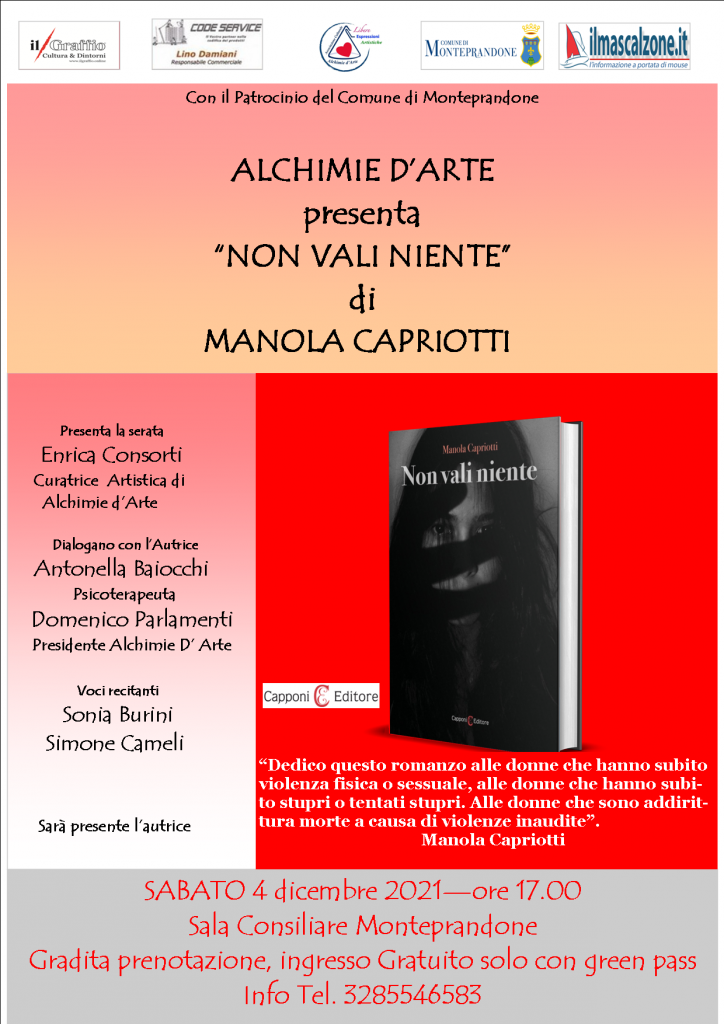 Nuovo evento culturale di Alchimie d’Arte con il Patrocinio del Comune di Monteprandone, Sabato 4 Dicembre 2021 ore 17 presso la sala Consiliare di Monteprandone, con Manola Capriotti e il suo primo romanzo: "Non vali niente".