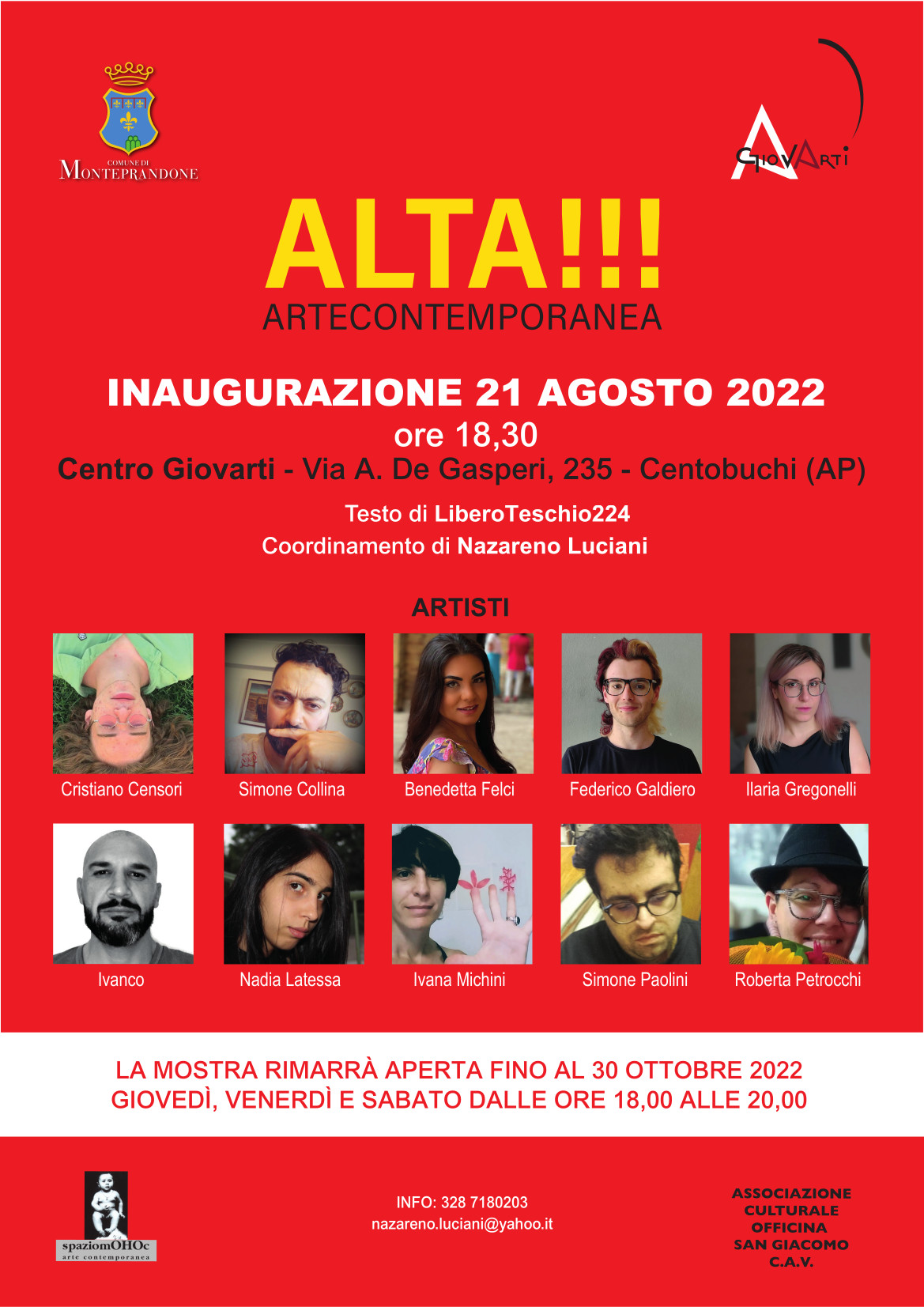 L’evento organizzato dall’associazione Officina San Giacomo e dallo SpaziomOHOc Arte Contemporanea di Nazareno Luciani lascerà spazio, a partire da domenica 21 agosto, ad una nuova esposizione di “Alta!!!”, la terza dell’anno realizzata con la collaborazione di dieci giovani artisti che daranno lustro e vita al territorio.
