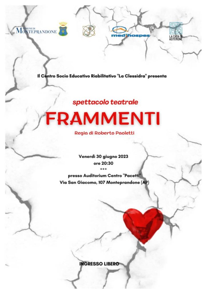 “Frammenti” è il nome dello spettacolo che i ragazzi e le ragazze, le operatrici e gli operatori del Centro Diurno Socio Educativo “La Clessidra” di Monteprandone porteranno in scena venerdì 30 giugno, ore 20:30, presso l’Auditorium del Centro Pacetti di Centobuchi.