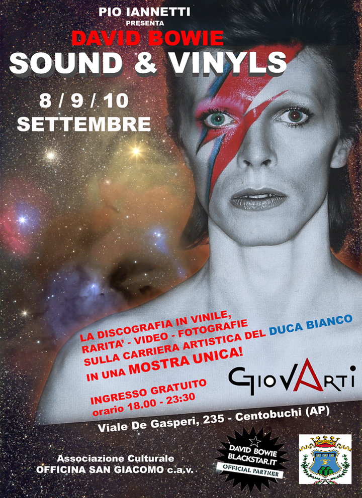 Patrocinata dal Comune, organizzata da Pio Iannetti in collaborazione con www.davidbowieblackstar.it e con l'associazione "Officina San Giacomo" di Monteprandone, l’esposizione, unica nel suo genere e mai realizzata prima in Italia, riguarderà materiale discografico, fotografico e oggettistica da collezione su David Bowie.