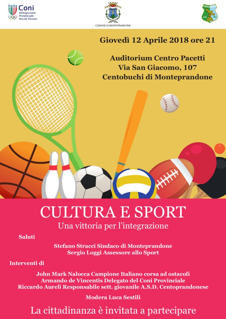 “Cultura e sport, una vittoria per l’integrazione”, questo il titolo del convegno che si terrà giovedì 12 aprile, alle 21, nella sala Auditorium del Centro Pacetti di Monteprandone.