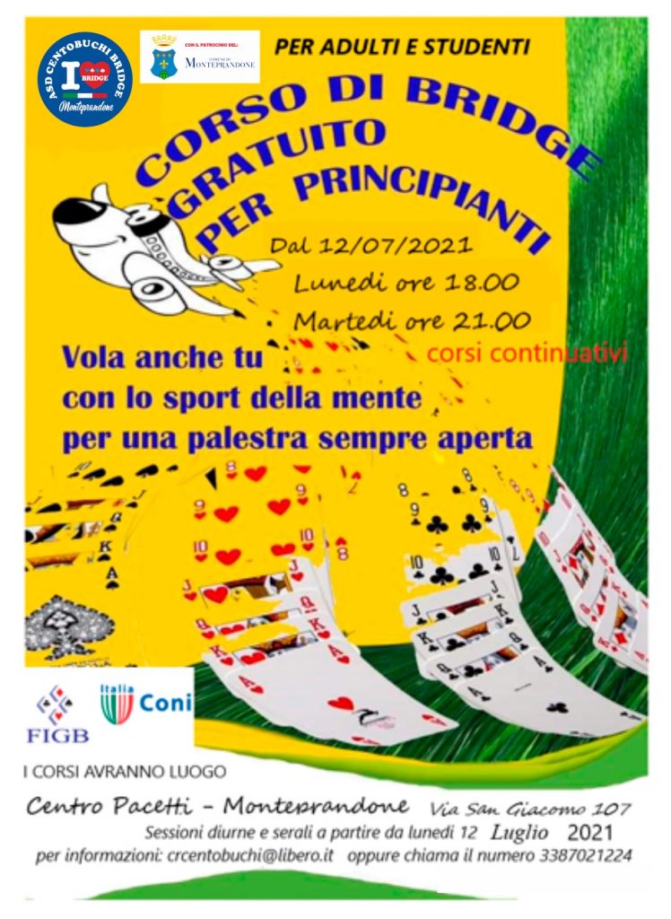 L'Asd Centobuchi Bridge organizza un corso di bridge gratuito per principianti sia per adulti, sia per studenti con sessioni diurne e serali.