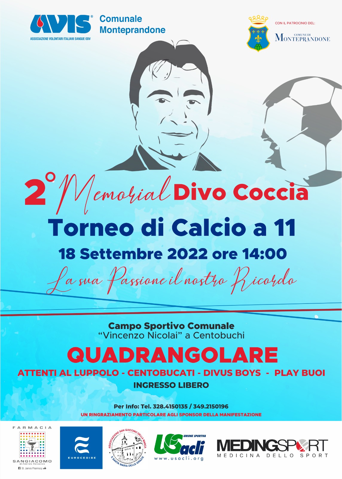 “Un torneo che nasce dal desiderio di ricordare una persona che nella sua umiltà ha contribuito alla crescita sociale del territorio - afferma Fratini Marcello, attuale Presidente dell’Avis Comunale di Monteprandone - un torneo che aggrega e unisce diverse realtà e che veicola un messaggio tanto declamato quanto bistrattato nella pratica: l’unità fa la forza. Un ringraziamento particolare all’Amministrazione Comunale, alle associazioni e società sportive del territorio, US Acli, ASD Centobuchi 1972 MP, ASD Monteprandone, Atletico Centobuchi, ASD Calcio Cento 2010, Vis Centobuchi, ASD Futsal Prandone, ASD Avis Monteprandone – Podistica Centobuchi, Pro Loco Monteprandone, Associazione San Giacomo della Marca e Santa Maria delle Grazie, Meding Sport – medicina dello sport, Farmacia San Giacomo, Eurocedibe e Seba. Spazio all’intrattenimento con la cronaca in diretta delle partite con la conduzione di Matteo Rosati e interviste a bordo campo tramite l’inviato speciale nonché atleta per l’occasione Marino de Giurdà".