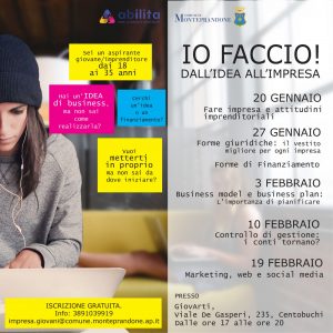 Partirà giovedì 20 gennaio il corso di formazione “Io faccio: dall’idea all’impresa”, ideato dalla cooperativa Abilita che gestisce lo Sportello Impresa Giovani, servizio di del Comune di Monteprandone.